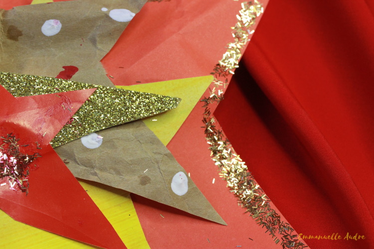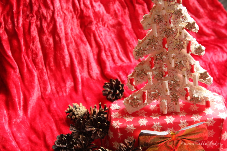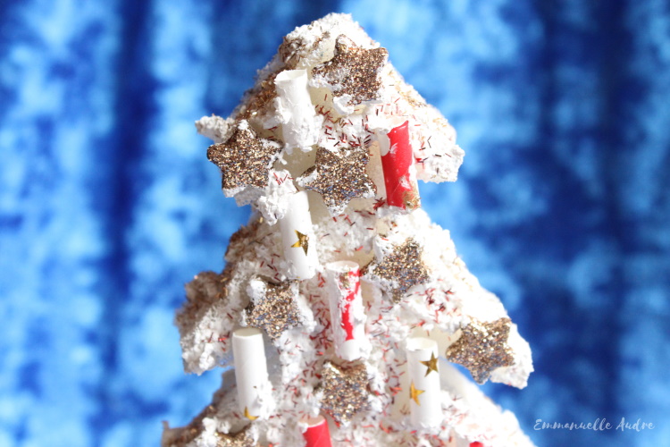Rodzaj użytych materiałów: biała gąbka, czerwone opakowanie po cieście, białe i czerwone rurki do picia, złote gwiazdki, farba śniegowa, złoty i czerwony brokat, złota kokarda, klej