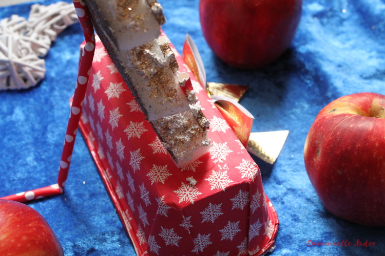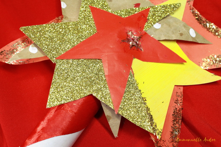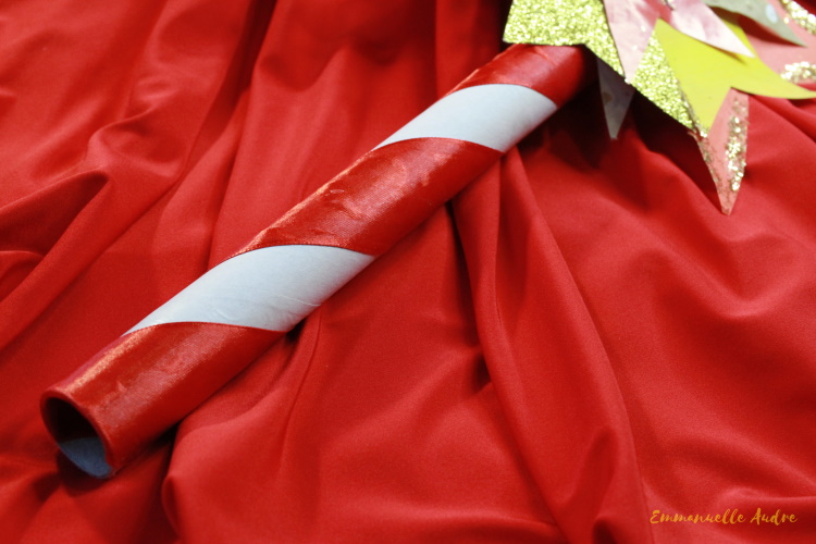 Rodzaj użytych materiałów: kartonowa rurka po papierowych serwetkach, papier kolorowy, papier brokatowy czerwony, żółty i brązowy, czerwona wstążka