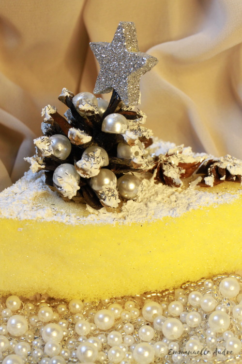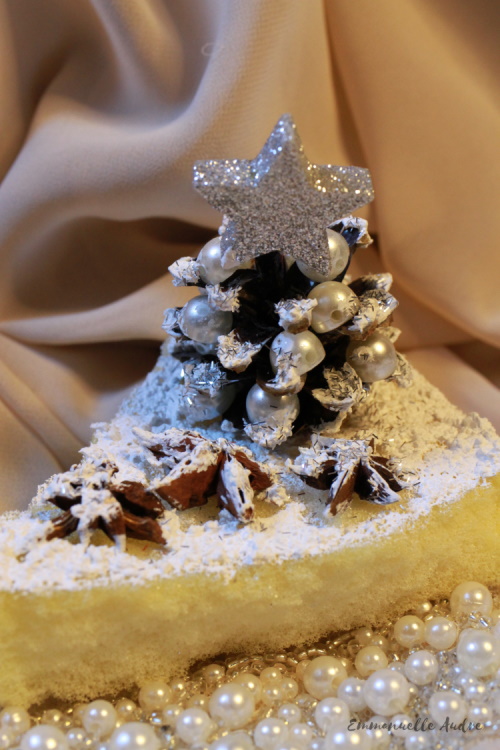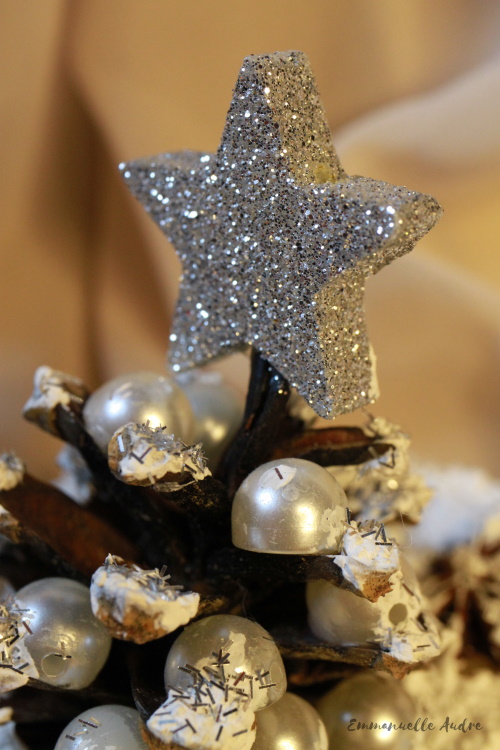 Rodzaj użytych materiałów: białe perełki, szyszka, srebrna gwiazdka, gąbka, anyż, pasta śniegowa, srebrny brokat, klej