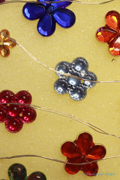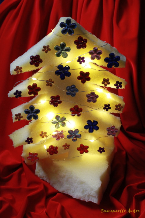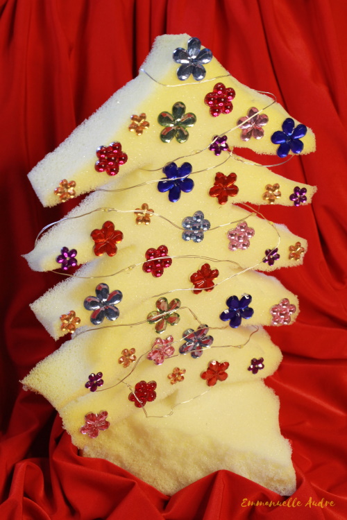 Rodzaj użytych materiałów: biała gąbka, kolorowe, plastikowe kwiatki, lampki ledowe na baterie