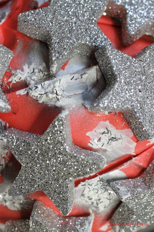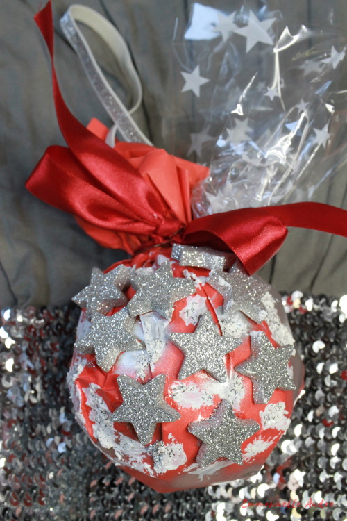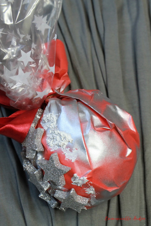 Rodzaj użytych materiałów: styropianowa kula, czerwony papier, srebrny spray, srebrne gwiazdki, czerwona wstążka, folia do kwiatów, pasta śniegowa, srebrny brokat, drucik, klej, srebrna gumka