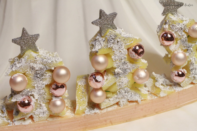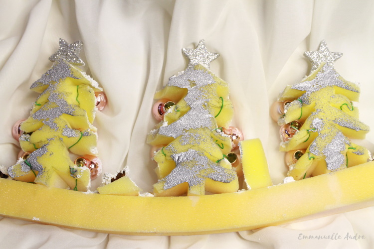 Rodzaj użytych materiałów: gąbka, różowe bombki, srebrne gwiazdki, pasta śniegowa, anyż, srebrny brokat