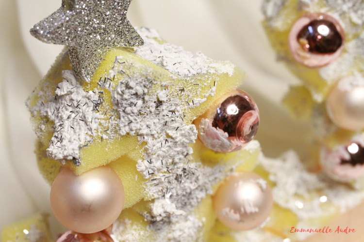 Projekt „Trzy choinki z gąbek z różowymi bombkami, srebrnymi gwiazdkami, brokatem i śniegiem”